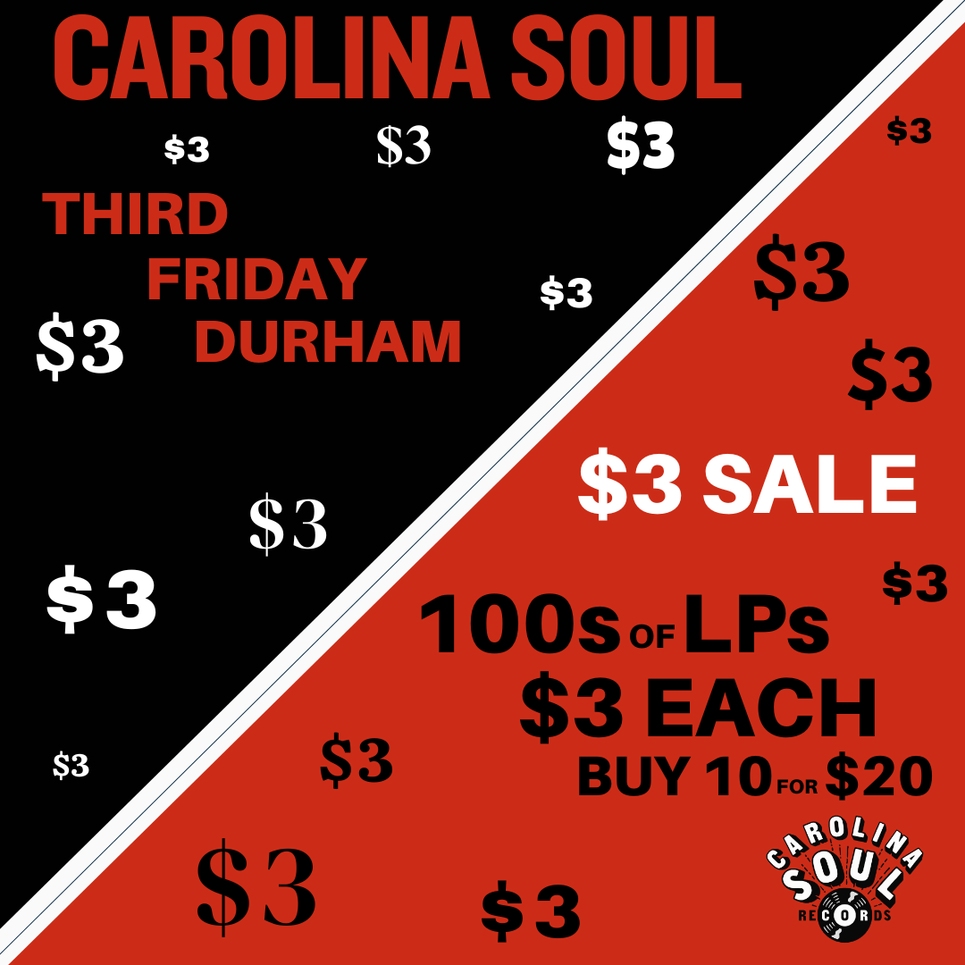 Pass the threes! The $3 Sale happens every third Friday of the month at 117 E. Main St. in Durham. We put out 100s of used LPs with Rock, Jazz, Soul and more ALL marked down to only $3/each.